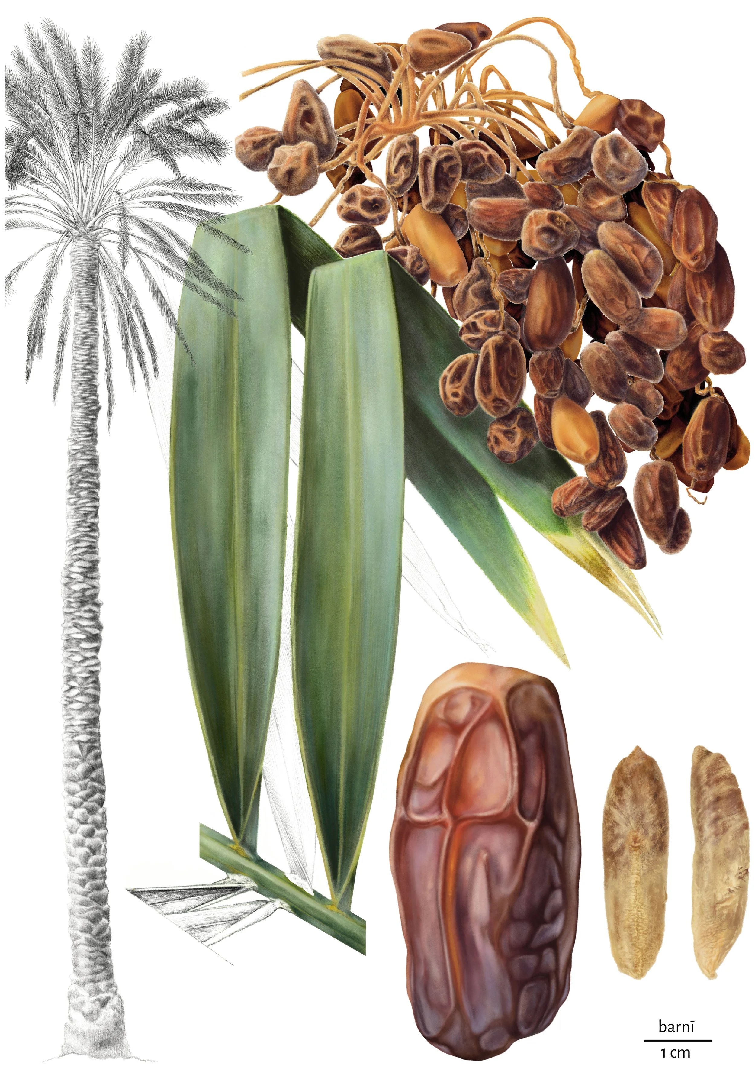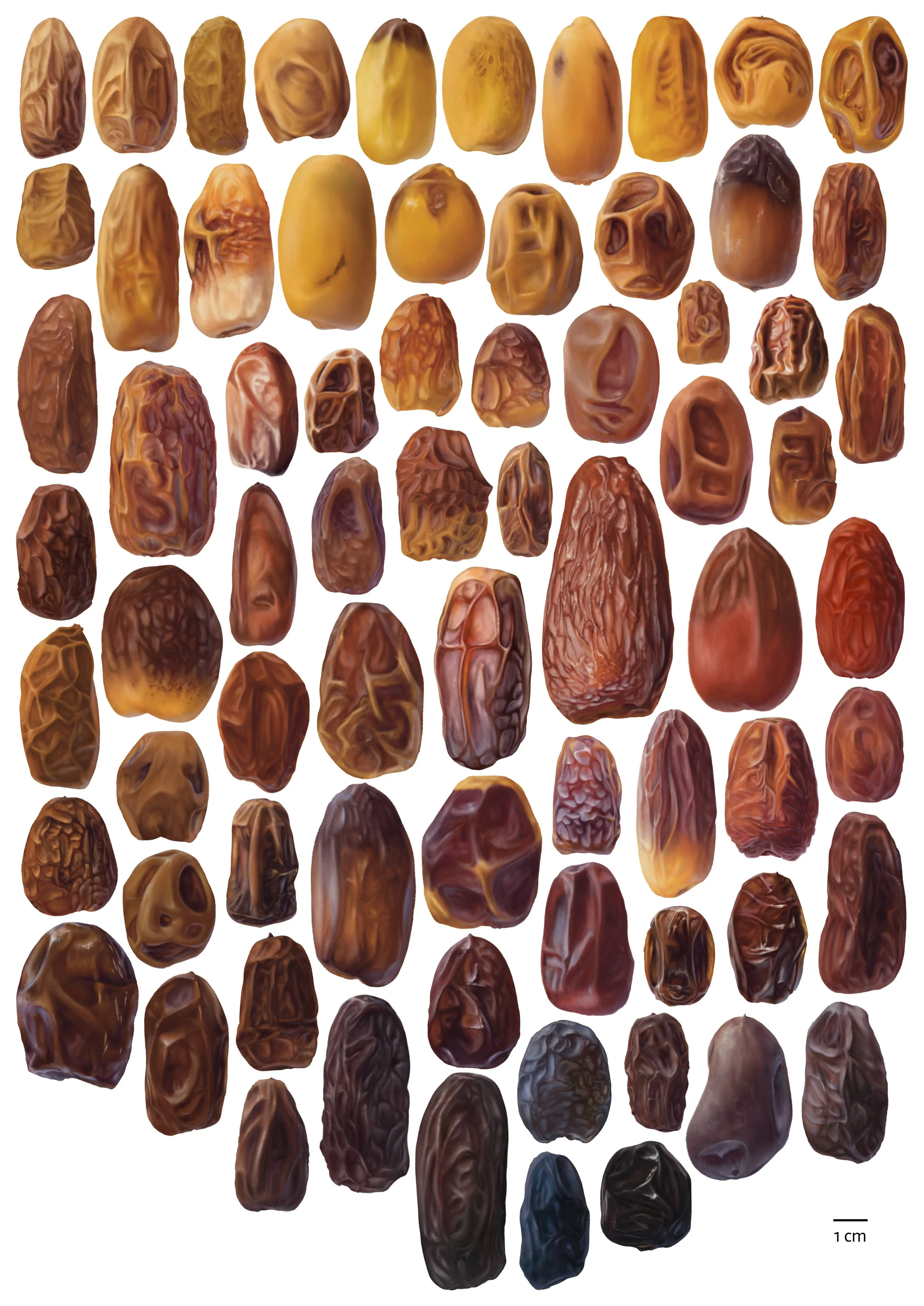 > Illustration of 71 varieties of date palm tree (Phoenix dactylifera)